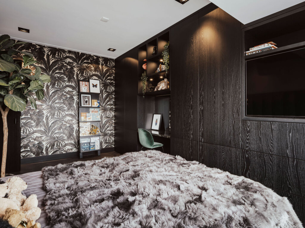 De volledige kastenwand is vervaardigd uit massief eikenhout, afgewerkt met een zwarte open-nerf behandeling in matte uitvoering. Deze afwerking behoudt de natuurlijke structuur van het hout terwijl het een tijdloze uitstraling biedt die meegroeit met het kind naar de tienerjaren.