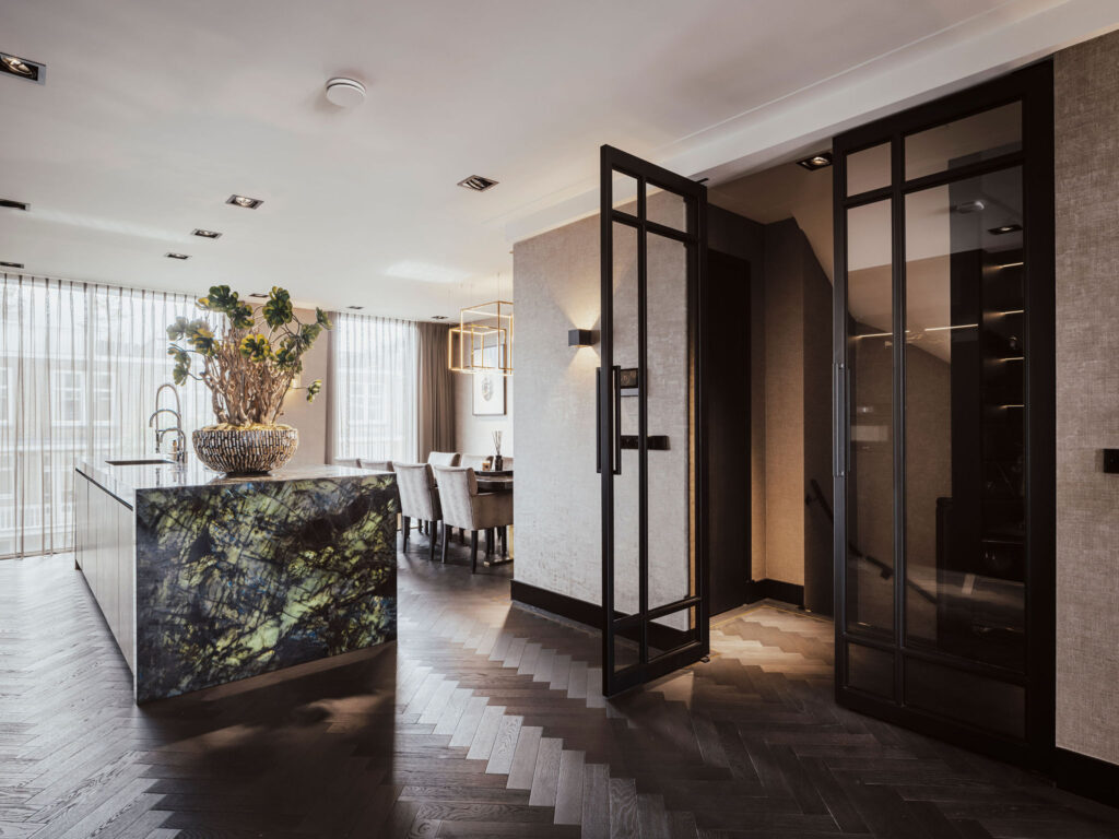 In het hart van Amsterdam Oud-Zuid heeft Hoy Renuncio een interieurcreatie gerealiseerd die de grenzen van conventioneel meubelontwerp verlegt. Dit spectaculaire project, bestaande uit een geïntegreerde keuken-showmeubel van bijna 15 meter lengte en een vrijstaand eiland, representeert het absolute toppunt van ambachtelijk meesterschap en innovatieve materiaaltoepassing.