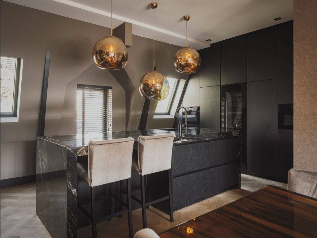 Het keukengedeelte vormt een naadloos verlengstuk van het geheel, met hoge kasten die maximale opbergruimte bieden zonder de visuele continuïteit te doorbreken. De keuken is uitgerust met premium Miele apparatuur die technologische excellentie verzekert.