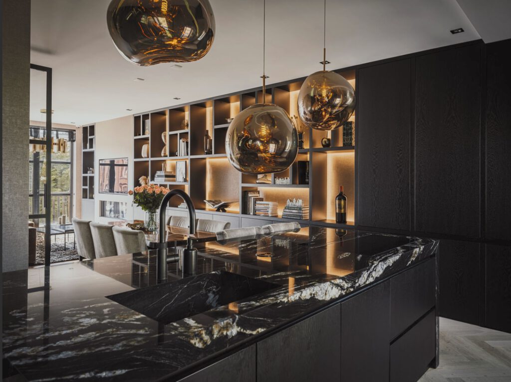 Hoy Renuncio heeft een indrukwekkend multifunctioneel ensemble gecreëerd dat de grenzen tussen keuken, entertainment en expositieruimte vervaagt. Met een imposante lengte van 10 meter vormt dit monolithische meubel de ruggengraat van de leefruimte, waarbij verschillende woonfuncties naadloos in elkaar overvloeien.
